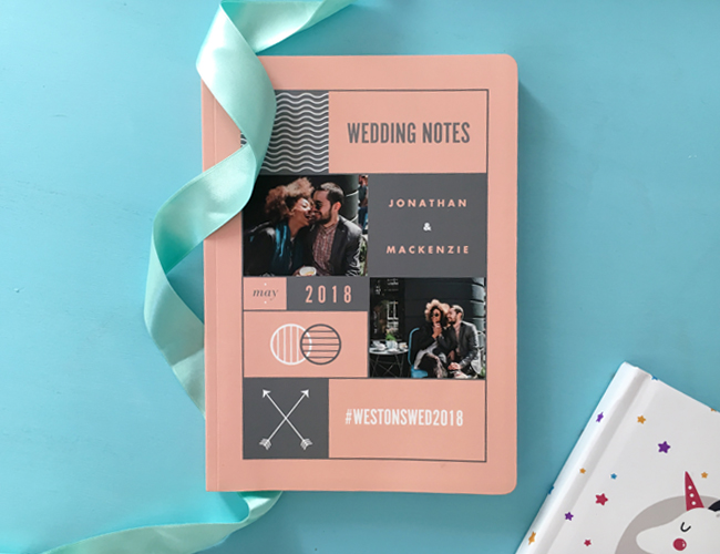 Customize a wedding planning notebook for your bestie, complete with wedding hashtag! Makes a wonderfully personal and affordable engagement gift.